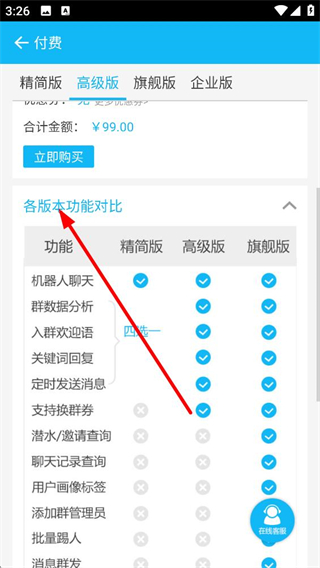 4、付費頁面下方可查看各版本功能對比,能清晰了解精簡版高級版等機器人聊天入群歡迎語等功能上的差異,便于選擇適配的版本。