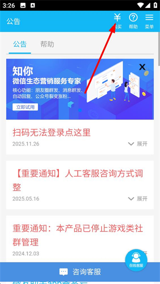 1、進入工具首頁,點擊右上角購買按鈕可進入付費頁面,首頁同時展示公告內容,包含登錄指引客服調整等通知,輔助用戶了解工具最新信息。