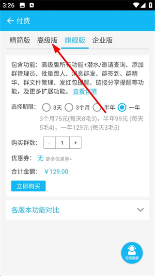 2、進入付費頁面后,可選擇精簡版高級版等不同版本,以旗艦版為例,其包含潛水查詢群管理員等功能,可選擇3天至一年不等的使用期限。