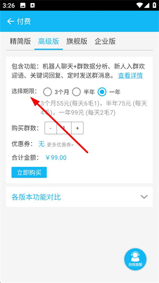 3、切換到高級版付費界面,該版本包含機器人聊天群數據分析等功能,選擇一年期限時合計金額為99元,也可調整購買群數來適配需求。
