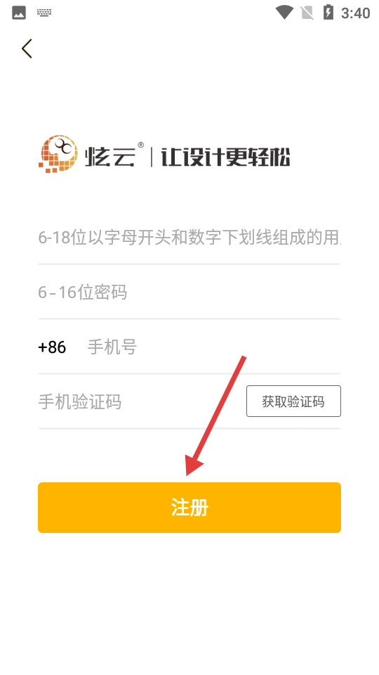 2、注冊界面規定用戶名與密碼格式,需填手機號、獲取驗證碼,完善信息后點擊注冊,開啟設計新體驗。