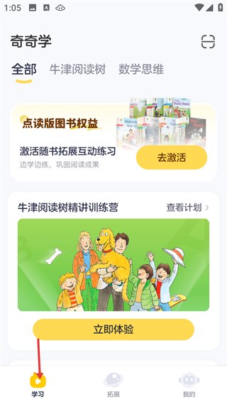 1、學習頁,分牛津閱讀樹等板塊,有點讀版圖書權益激活入口,設精講訓練營,支持隨書互動練習,鞏固閱讀成果。