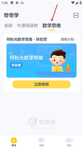 2、數學思維板塊頁,主推何秋光數學思維體驗營,課程由學前數學教育專家研發,提供立即體驗入口,聚焦少兒思維訓練。