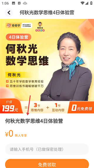 3、體驗營詳情頁,何秋光數學思維4日營含4節內容,新人0元領,需輸手機號,依托專家五十余年經驗,價值199元。