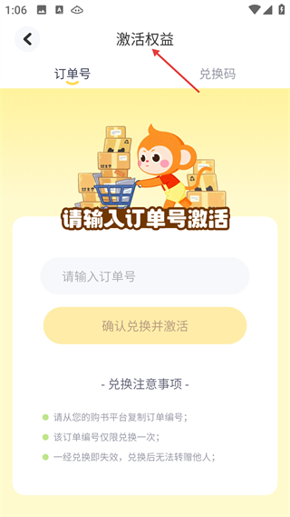 4、激活權益頁,支持訂單號或兌換碼激活圖書權益,訂單號限兌一次,兌后失效不可轉贈,需從購書平臺復制編號。
