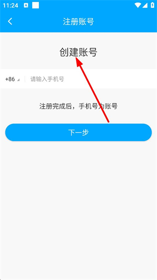 2、注冊賬號界面,可創建賬號,輸入手機號,注冊完成后手機號為賬號,點擊下一步繼續注冊流程,完成賬號創建以使用APP功能。