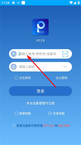 1、進入登錄界面,可輸入賬號、手機號、設備號和密碼進行登錄,可選擇記住密碼,若忘記密碼可點擊找回,還可選擇地圖類型,勾選用戶協議和隱私政策后登錄。