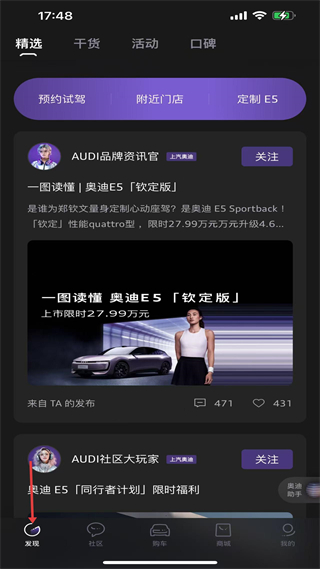 1、發現頁,提供預約試駕、門店查詢等服務入口,展示奧迪E5車型資訊,含品牌賬號內容,支持互動關注,是品牌信息聚合頁。