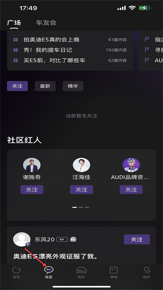 2、社區頁,設廣場、車友會板塊,含車型相關話題標簽,展示社區紅人,支持關注互動,是車主粉絲的交流平臺。
