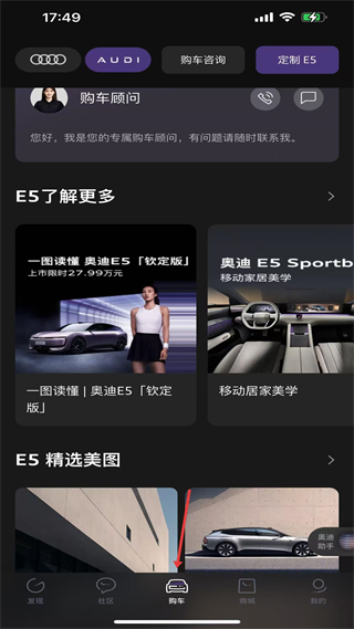 3、購車頁,配備專屬購車顧問,展示奧迪E5車型詳解、美圖,提供定制車型入口,是車型了解與購車服務頁。