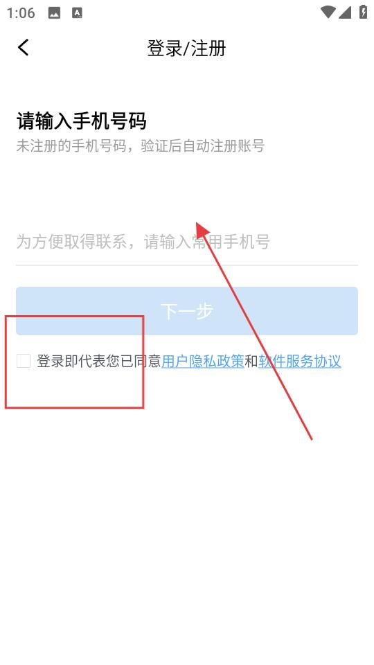 2、完成登錄,輸入手機號碼,勾選同意協議,點擊下一步進行登錄使用。