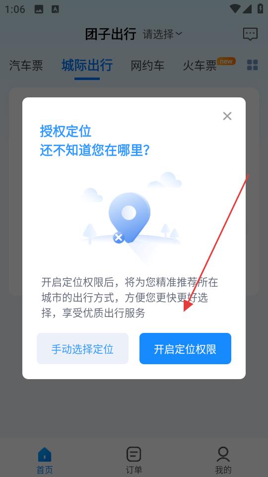 3、登錄成功后,若有授權定位彈窗,可選擇開啟定位權限,便于獲取所在城市出行推薦,也可手動選擇定位。