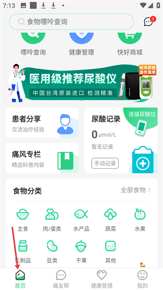 1、首頁板塊有嘌呤查詢、健康管理等功能入口,含患者分享、痛風專欄、尿酸記錄,還有食物分類查詢,助用戶管理痛風飲食。