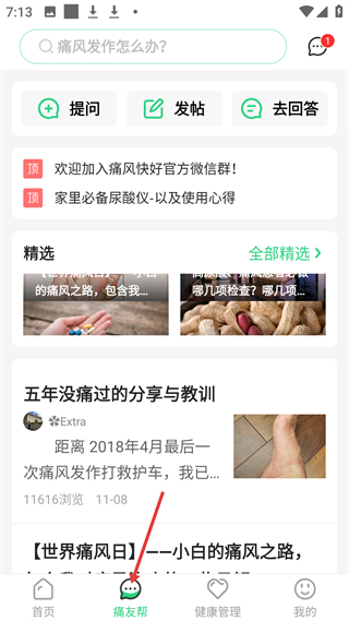 2、痛友幫板塊支持提問發帖回答,有痛風患者經驗分享精選,如五年沒痛過的分享與教訓,方便患者交流治療經驗。