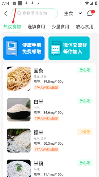 3、食物嘌呤查詢板塊可查主食類食物嘌呤,如面條白米放心吃糯米少量吃,還可領健康手冊加交流群,助力控制嘌呤攝入。