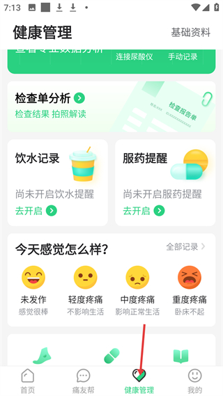 4、健康管理板塊有檢查單分析、飲水服藥提醒,可記錄痛風疼痛狀態,能連尿酸儀或手動記錄,輔助全面管理痛風健康。
