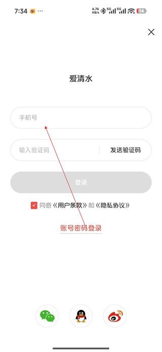 1、打開愛清水進入登錄頁面,輸入手機號碼并點擊發送驗證碼,填寫收到的驗證碼后勾選相關協議,點擊登錄按鈕登錄。