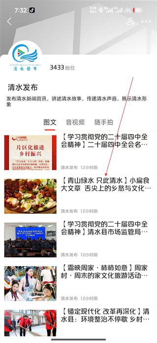 2、登錄后進入清水發布頁面瀏覽圖文音視頻等分類內容,查看各類資訊標題及發布時間,選擇感興趣的資訊點擊進入該資訊的詳情頁面。