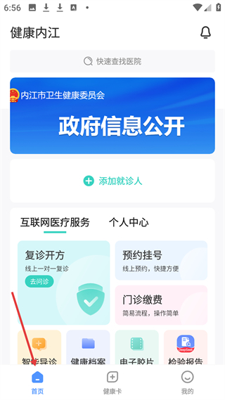 1、首頁有搜索醫院功能,展示內江市衛生健康委員會政務府信息公開內容,可添加就診人,提供復診開方、預約掛號等互聯網醫療服務。