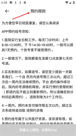 2、預約規則頁面介紹APP預約掛號須知,包括門診時間、號源發放、實名制就診退號限制、預約未支付操作次數等規定。
