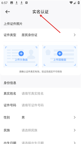 3、實名認證頁面需上傳居民身份證頭像面和國徽面照片,填寫真實姓名、證件號碼、性別、民族、出生日期等身份信息。