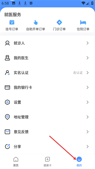 4、我的頁面有就醫服務相關訂單入口,可管理就診人、我的醫生,進行實名認證、銀行卡綁定,還有設置、地址管理等功能。