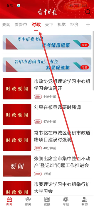 1、打開晉中日報APP,點擊時政板塊,瀏覽時政要聞,如市政協黨組理論學習中心組學習會議召開、劉星在祁縣調研等,了解本地時政動態。