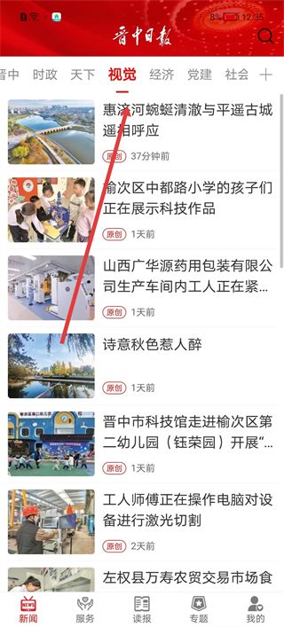 3、點擊視覺板塊瀏覽視覺新聞,如惠濟河蜿蜒清澈與平遙古城遙相呼應、榆次區中都路小學展示科技作品等,查看新聞圖片和相關報道。