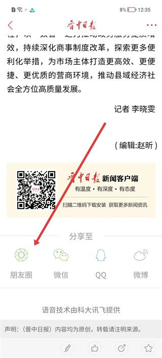 4、在新聞詳情頁面點擊分享至朋友圈、微信等渠道,將新聞分享出去。