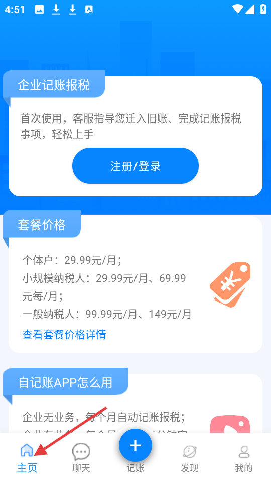 1、主頁呈現企業記賬報稅服務,新用戶有客服引導,清晰列出個體戶等套餐價格,方便用戶了解費用。