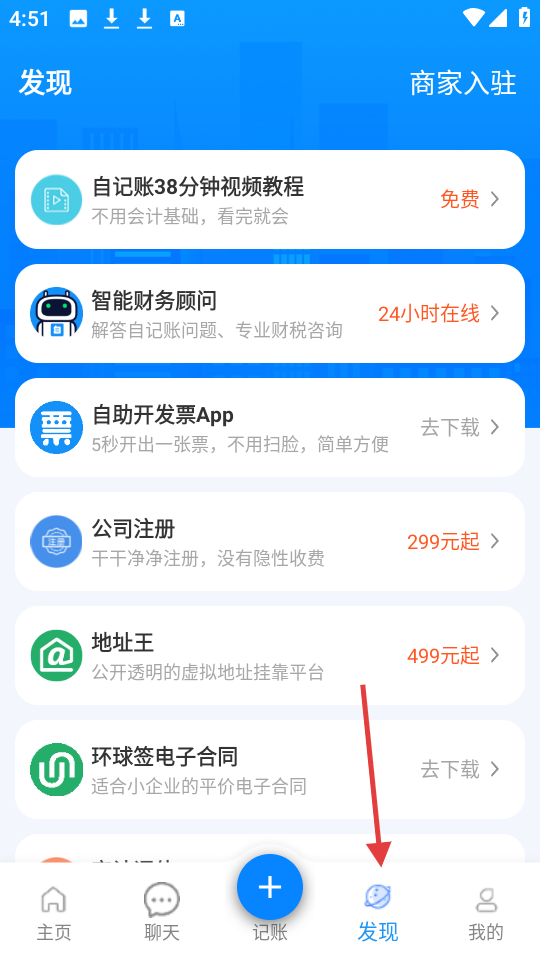 2、發現頁匯聚多樣功能,如免費視頻教程、24小時在線智能顧問,還有開發票APP下載與工商財稅業務滿足多元需求。
