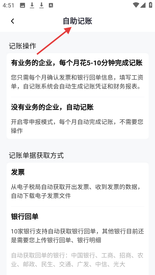 3、自助記賬界面,區分有業務和無業務企業記賬模式,詳細介紹記賬單據獲取方法,便于用戶掌握記賬操作要點。