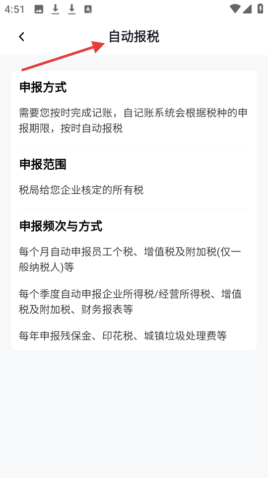 4、自動報稅頁面說明申報依賴記賬,系統依期限自動報稅,明確各時段申報稅種范圍,助力企業了解報稅安排。