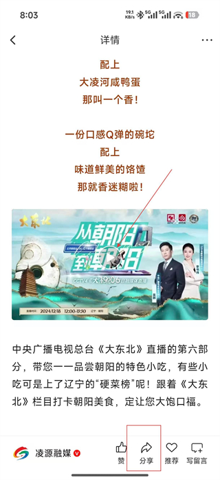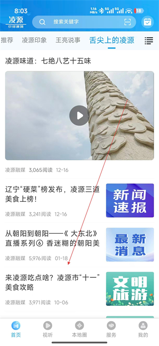 1、打開凌源融媒軟件,進入首頁后,選擇舌尖上的凌源板塊下的目標資訊,點擊進入詳情頁面。