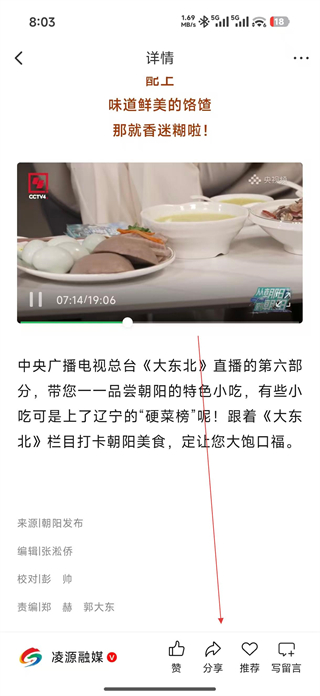 2、在資訊詳情頁面可查看朝陽特色小吃的介紹內容,點擊視頻觀看了解更多凌源及朝陽地區的美食、文化等本地信息。