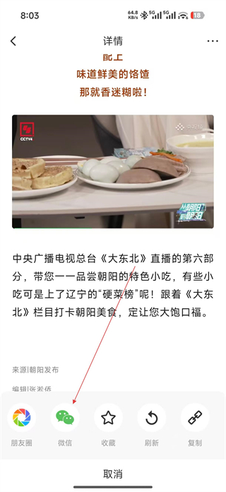 4、在分享選項界面中選擇微信渠道,將該本地美食資訊分享給好友,讓更多人了解朝陽的特色小吃內容。