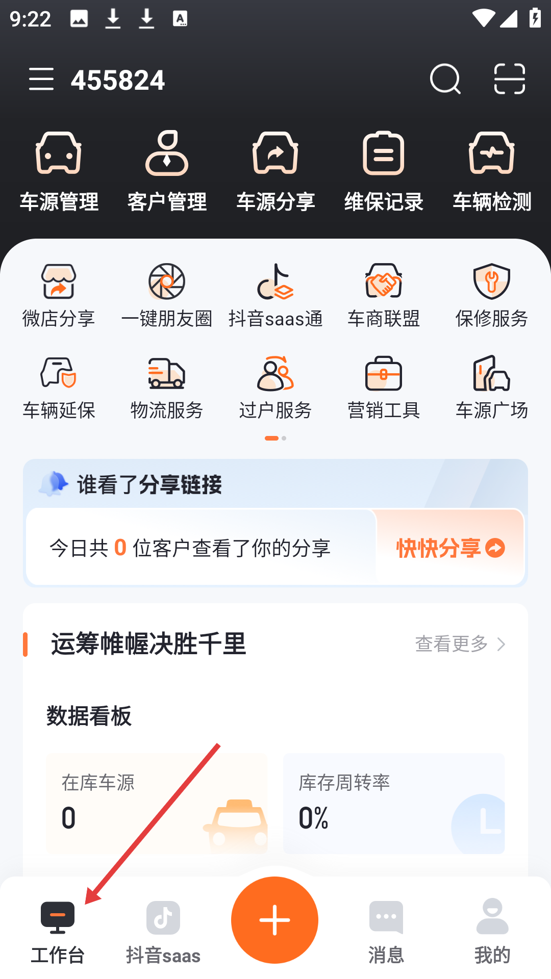 1、汽車服務類APP工作臺,有車源、客戶管理等功能,支持多平臺分享,能查看分享數據與在庫車源、庫存周轉率等數據看板。