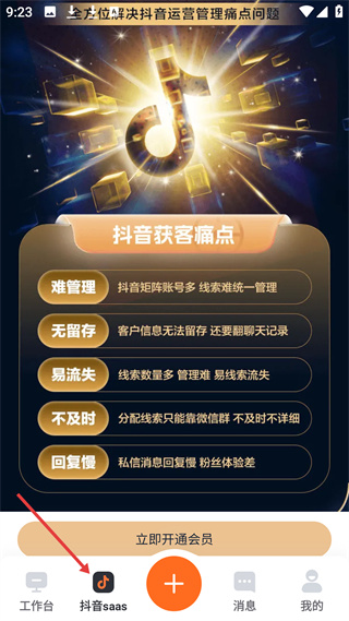 2、抖音saas頁面聚焦抖音獲客痛點,如矩陣賬號難管、線索易流失等,助力解決運營問題,可開通會員優化抖音運營。