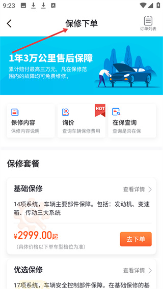 3、保修下單頁提供1年3萬公里售后保障,可查看保修內容、詢價、查詢在保情況,還有基礎、優選等保修套餐可選。