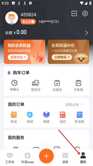 4、我的頁面展示用戶信息、余額,有會員權益板塊,可管理購車訂單及車況、檢測等各類訂單與服務方便用戶操作。