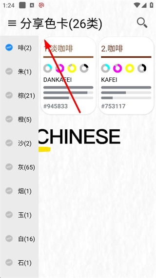 4、進入完整色卡對應的色卡界面,能看到26類色卡分類,可瀏覽淡咖啡等不同色系的色卡,同時查看每類色卡對應的具體色彩參數。