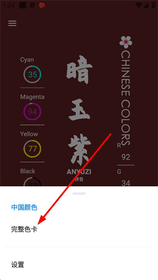 3、點擊菜單按鈕展開選項后,能看到中國顏色相關分類,選擇完整色卡選項,即可進入色卡的詳細瀏覽界面,獲取更多色系的內容。