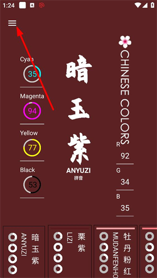 2、選定暗玉紫選項后,界面會顯示該顏色對應的Cyan、Magenta等參數數值,點擊左上角的菜單按鈕,可展開包含更多操作功能的選項列表。