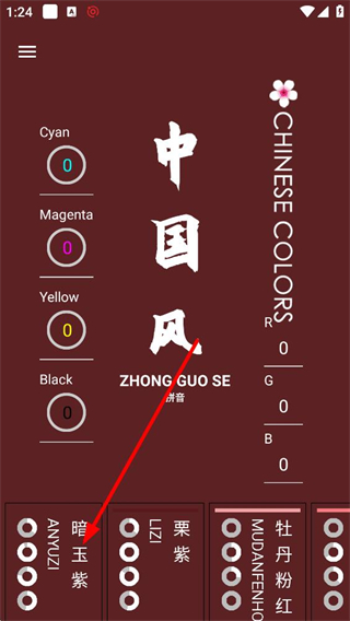 1、進入中國風界面,可見中國風字樣,下方排列著暗玉紫、栗紫等顏色選項,選擇其中一個顏色選項,就能查看該色彩界面中的呈現效果,開啟色彩體驗流程。