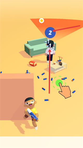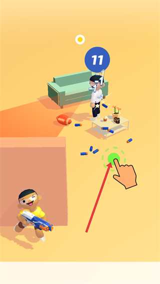 1、操控角色,點擊綠色區域,用武器射擊目標人物,目標人物頭上有數字顯示,射擊可減少數字,逐步削弱目標。