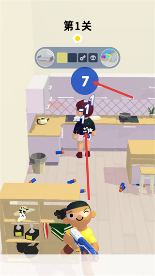 2、持續射擊目標,當目標人物頭上數字減到特定數值時,會出現紅色警示效果,此時仍需繼續攻擊,推進游戲進程。