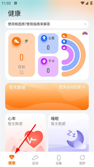 1、進入健康界面,可查看步數、公里數、千卡等運動數據,還有心率、睡眠等健康數據,底部有健康、運動、設備、我的等導航選項。