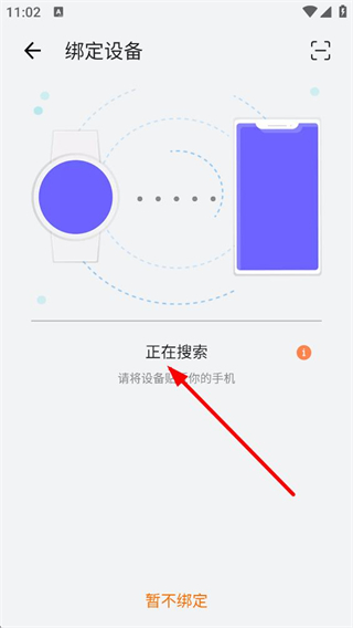 3、綁定設備界面,APP會搜索附近可綁定的設備,需將設備貼近手機以完成搜索,也可選擇暫不綁定,根據自身需求決定是否綁定設備。