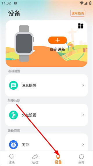 2、點擊設備選項,進入設備界面,可綁定運動設備,設置消息提醒、久坐設置、鬧鐘等功能,頂部有使用指南入口,方便了解設備使用方法。