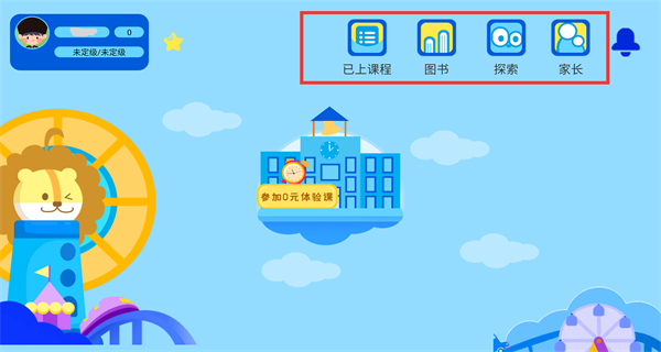 1、進入游戲主界面,可見已上課程圖書探索家長等功能按鈕,界面還有參加0元體驗課的入口,可選擇該入口開啟對應的閱讀學習體驗。